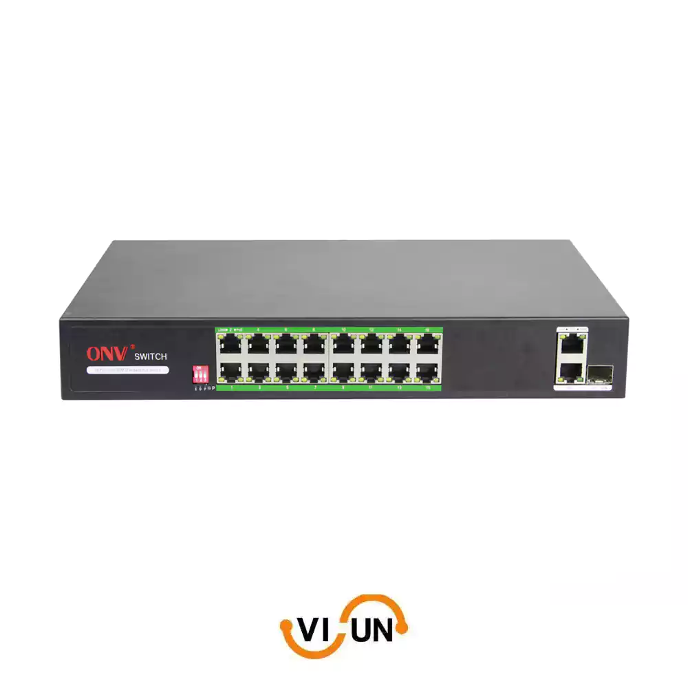 سوییچ شبکه ۱۶پورت POE از برند onv یکی از انواع مدل‌ای بسیار ببا کیفیت است. این محصول از تکنولوژی poe بهره برده و در صورتی که دوربین شما نیز دارای سیستم poe باشد میزان سیمکشی به طرز چشمگیری کاهش می‌یابد چرا که شما برق و دیتا را با یک سیم می‌توانید منتقل کنید. این محصول برای تمامی برندهای دوربین تحت شبکه گزینه‌ای ایده‌آل است. از دیگر امکانات فنی این دستگاه عبارتند از: