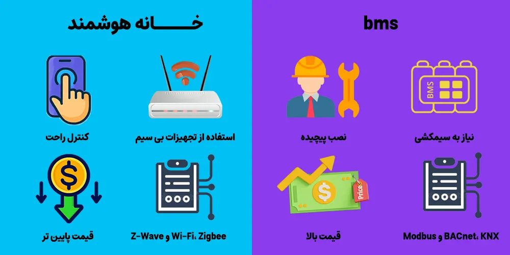 خانه هوشمند و bms از نظر کاربرد، هدف، پروتکل، دسترسی کنترل و شخصی تفاوتهای بارزی با یکدیگر دارند که در ادامه به طور کامل به این موارد خواهیم پرداخت.